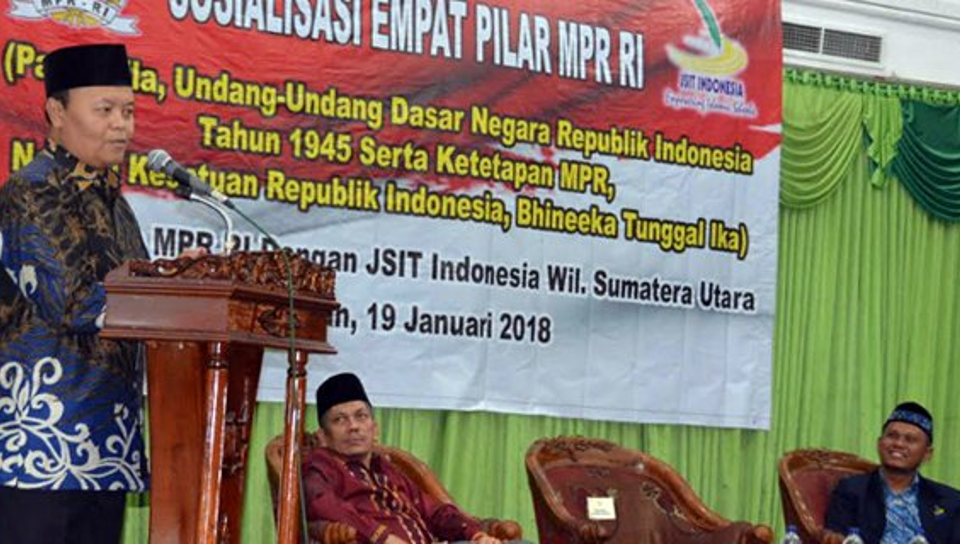 Wakil Ketua MPR Hidayat Nur Wahid membuka Sosialisasi Empat Pilar MPR di Gelora Ballroom Hotel Madani, Medan Sumatera Utara, pada Jum’at (19/1).