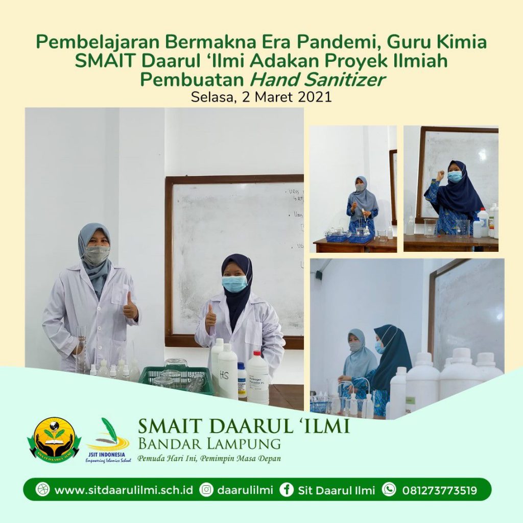 Bandar Lampung (06/03) — Setelah sukses mengadakan proyek ilmiah seri hidroponik, kini SMAIT Daarul ‘Ilmi melaksanakan Proyek Ilmiah Seri Pembuatan Hand Sanitizer Standar WHO (World Health Organization), di Lampung, (02/03/2021).