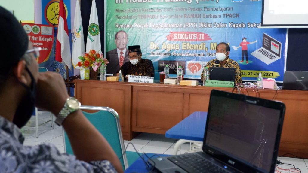 Kegiatan In House Training (IHT) ini dilaksanakan dalam dua siklus. Siklus pertama telah terlaksana pada Sabtu, 17 Juli 2021 di Aula SD IT Nur Hidayah Surakarta. Bertindak sebagai narasumber siklus pertama, Ratna Juwita, selaku Widyaiswara Lembaga Pengembangan dan Pemberdayaan Kepala Sekolah dan Pengawas Sekolah (LPPKSPS).