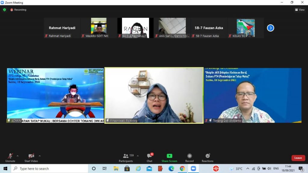 Solo (18/09) — SD Islam Terpadu Nur Hidayah Surakarta menggelar Webinar Parenting dan Kesehatan, Sabtu (18/09). Bertajuk ‘Disiplin AKB (Adaptasi Kebiasaan Baru) Sukses PTM (Pembelajaran Tatap Muka).’