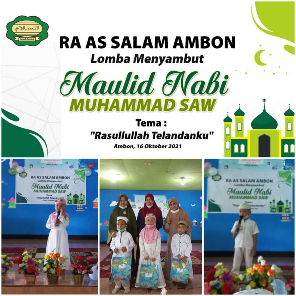 Ambon (22/10) — RA As Salam Ambon turut menyemarakan Maulid Nabi Muhammad SAW dengan mengadakan lomba untuk siswa-siswi RA As Salam dengan tema ‘Rasulullah Teladanku’.