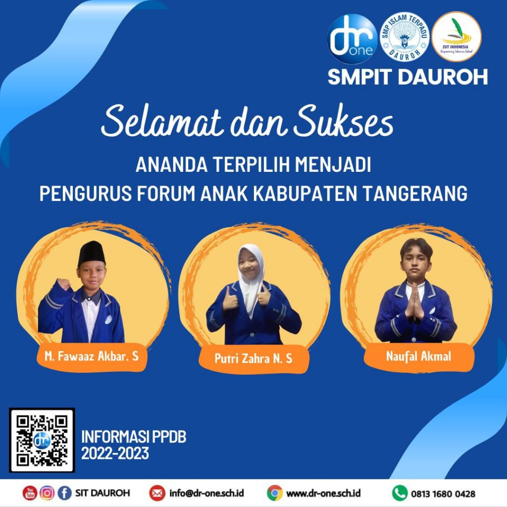 “Dan kami mengucapkan Selamat dan Sukses kepada ananda Putri Zahra, ananda Muhammad Fawaaz Akbar, dan Ananda Naufal Akmal yang terpilih dan lolos menjadi pengurus Forum Anak Kabupaten Tangerang periode 2022-2025,” Ucap Imam Sucipto, selaku Kepala Sekolah Islam Terpadu Dauroh.