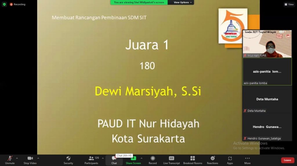 Pengumuman hasil lomba disampaikkan oleh Panitia Lomba melalui platform zoommeeting, diikuti oleh Pengurus JSIT Wilayah Jawa Tengah, dewan juri, Kepala Sekolah SIT se Jawa Tengah, dan para peserta lomba, Selasa (01/03/2022).