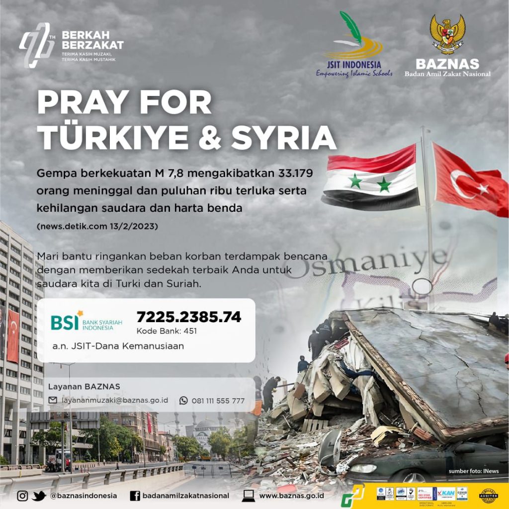 Jakarta (11/02) — Jaringan Sekolah Islam Terpadu (JSIT) Indonesia bekerjasama dengan Badan Amil Zakat Nasional (BAZNAS) RI melakukan penggalangan dana zakat, infak, sedekah yang akan disalurkan untuk korban gempa Turki dan Suriah.