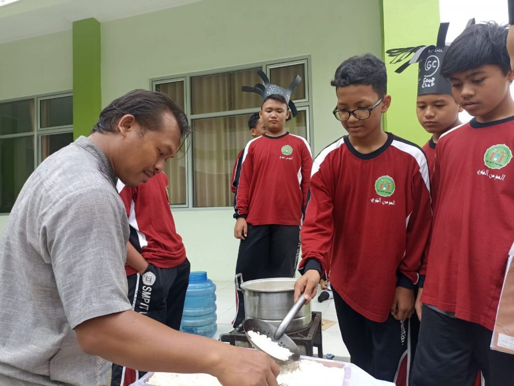 Tegal (02/02) — Masih dalam serangkaian program P5 sejumlah 28 siswa kelas 7 SMPIT Usamah, Rabu (1/02/2023) belajar proses membuat tahu aci yang merupakan makanan khas Tegal. Siswa mengolah proses pembuatan tahu dari kacang kedelai, membuat campuran aci dan menggoreng tahu aci hingga matang dan tersaji. Proses pembuatan tahu aci ini didampingi oleh Maria Adhiaty.