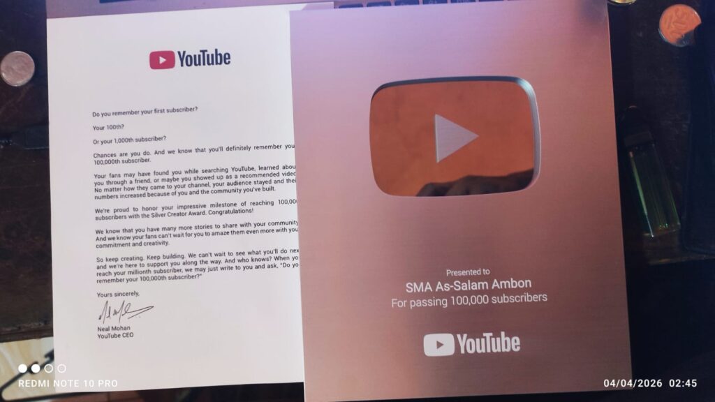 Penghargaan Silver Play Button merupakan bentuk apresiasi dari YouTube kepada kreator yang dinilai konsisten dalam menghadirkan konten positif serta mampu membangun komunitas audiens yang luas dan aktif. Kanal SMA As-Salam Ambon sendiri menampilkan beragam konten baik video pendek maupun livestreaming Kegiatan sekolah.